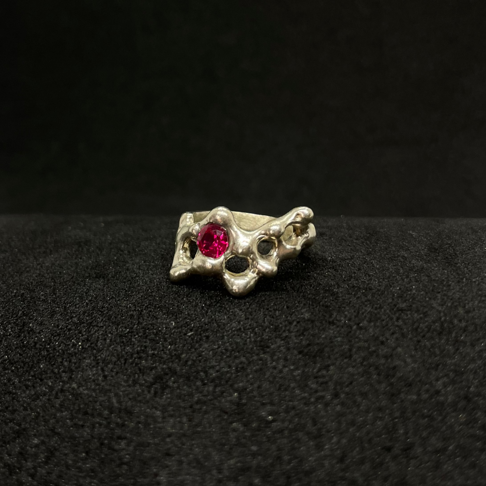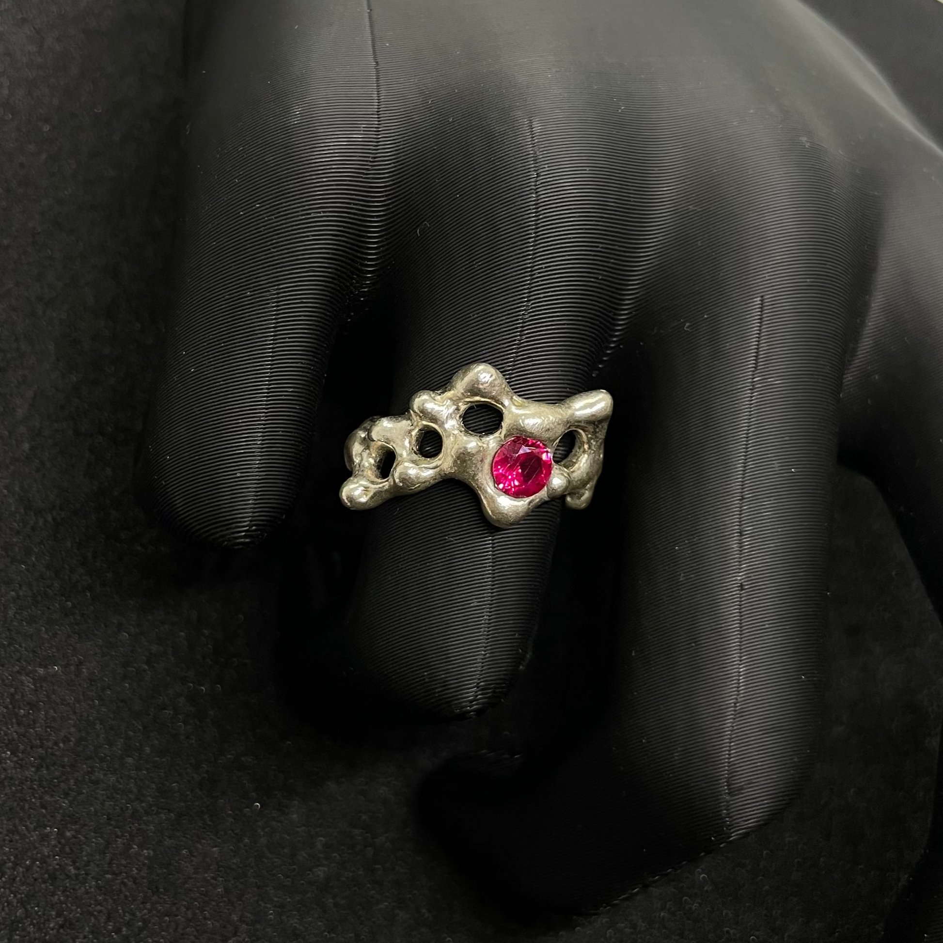 Este anillo destaca por una circonita rosa circular incrustada en el centro, rodeada de un diseño perforado irregular. Una pieza que juega con el espacio y la luz.