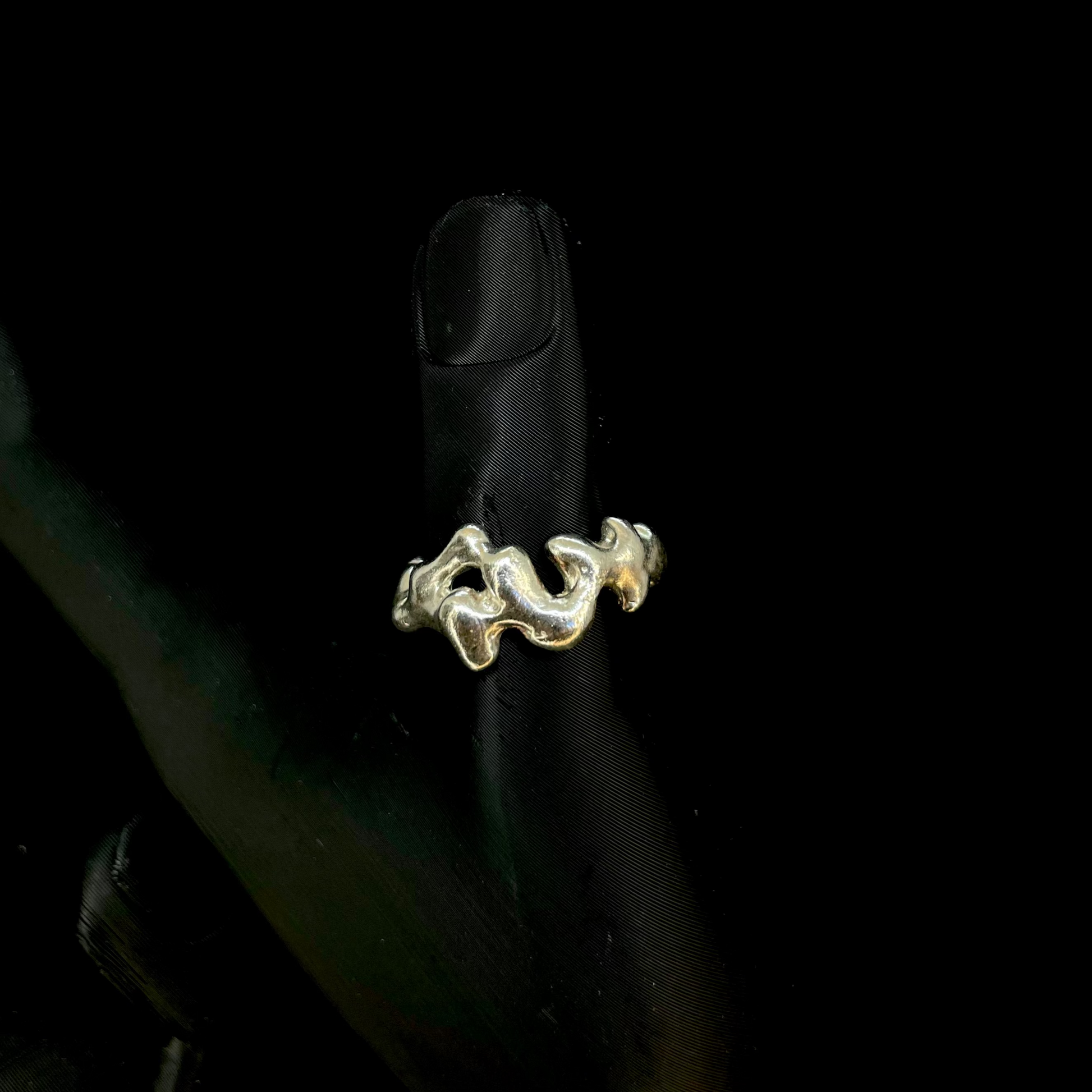Anillo de formas irregulares y volúmenes marcados, con curvas más pronunciadas que le dan fuerza visual. Su silueta parece esculpida en movimiento, con un carácter crudo y expresivo.