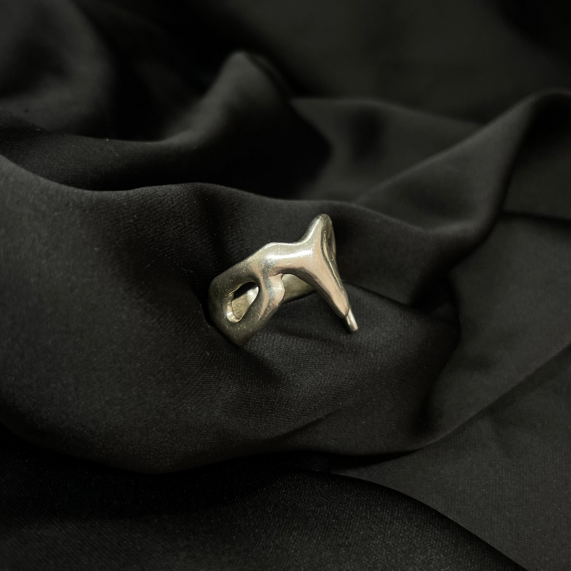 Anillo de volumen orgánico que evoca la forma de un hueso animal, abstracto e indefinido. Con fuerte presencia en la mano, es una pieza cruda y enigmática.