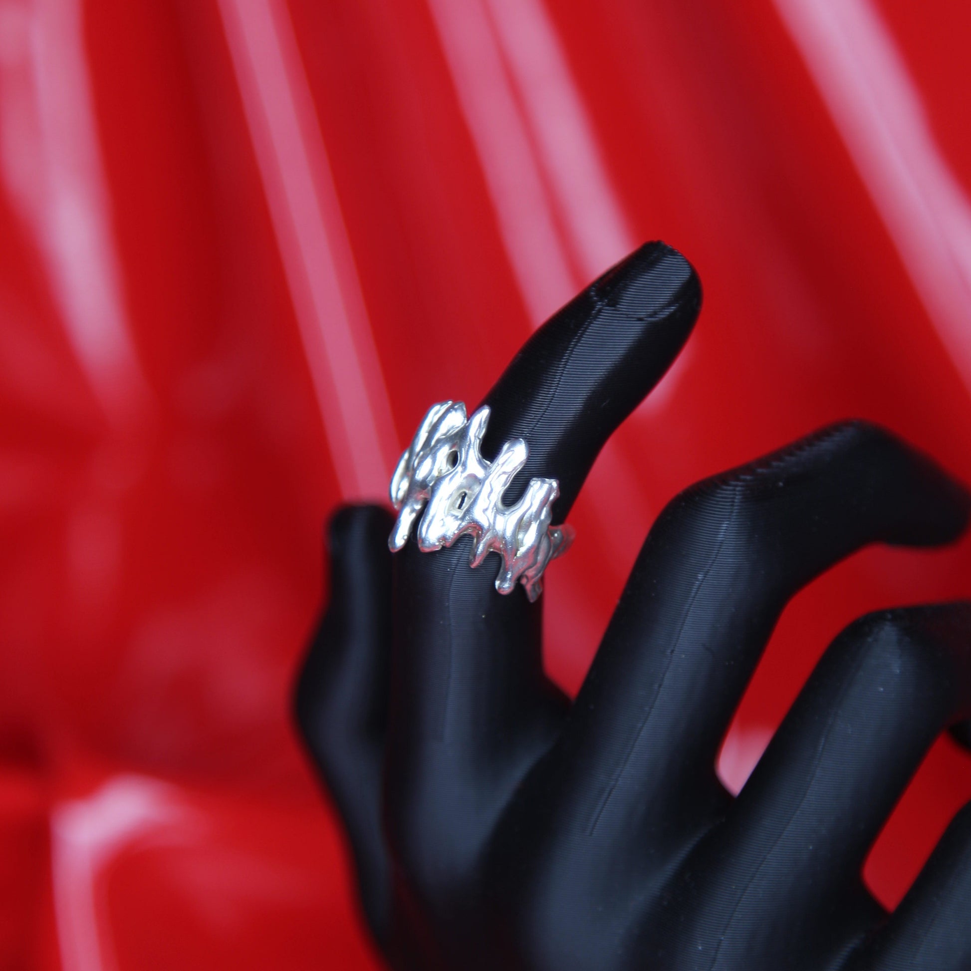 Anillo de plata hecho a mano, de estética intensa. Los rallones y puntas aportan una agresividad sutil, suavizada por formas derretidas. Una pieza que equilibra brillo y sombra.